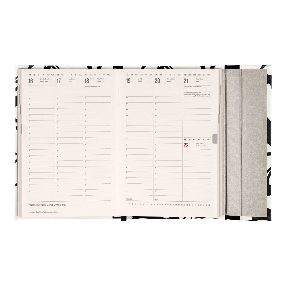 Wymiary: 11 x 16 cm Format: B6 Kalendarium: tygodniowe w 6 językach od grudnia 2024 (CZ, SK, HU, PL, RU, EN) Ilość stron: 144 strony wewnętrzne na żółtym papierze + 8 ilustracji na białym papierze Oprawa: książeczka twarda, zamykana na magnes Zawiera nazw