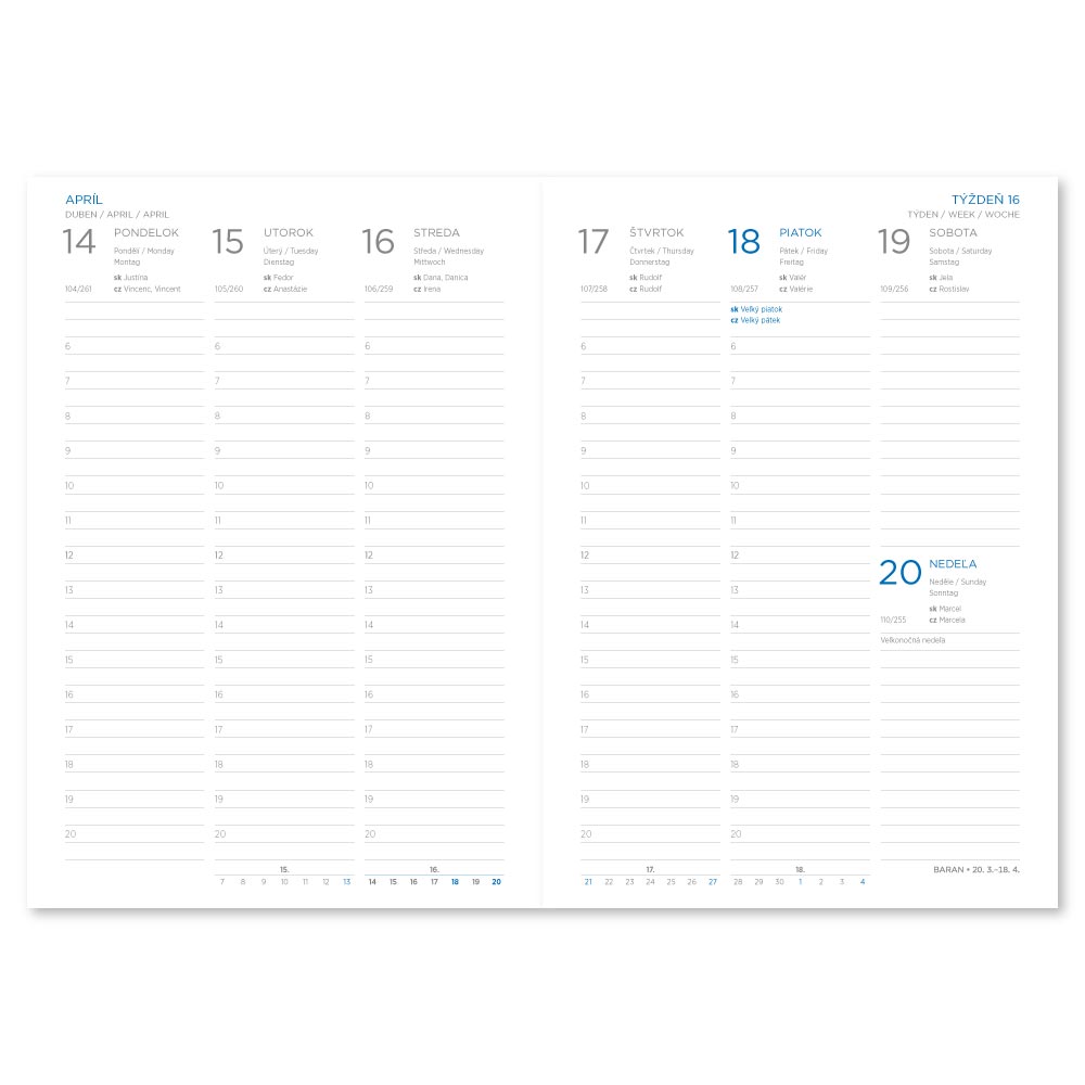 Wymiary: 148 x 210 mm Format: A5 Kalendarium: tygodniowe słowackie Objętość: 128 stron Papier: biały Materiał płyty: skóra ekologiczna Główny język: słowacki Inne języki: CZ, EN, DE Strony informacyjne obejmują: SK/CZ imiona, święta SK/CZ, Pla
