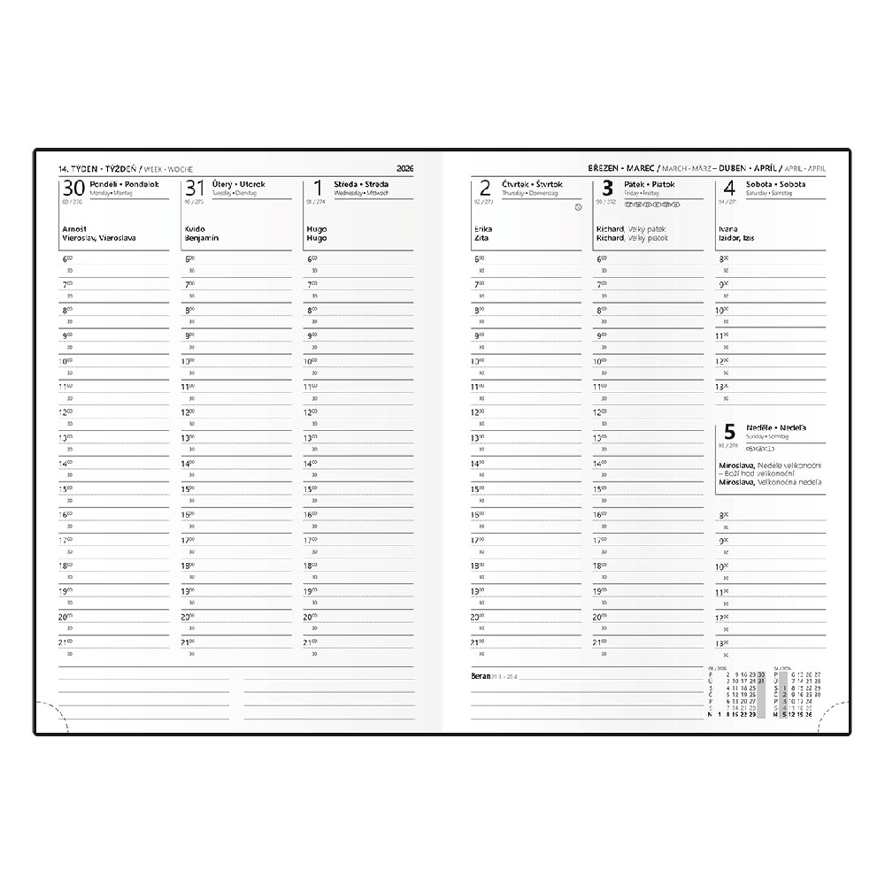 Wymiary: 143 x 205 mm Format: A5 Kalendarz: tygodniowy nominalny czeski i słowacki Mutacje językowe: CZ, SK, EN, DE Materiał okładki: materiał o drobnej strukturze Papier: biały w perforowanych rolkach Liczba stron: 144 Wiązanie: szyte wiązanie V8