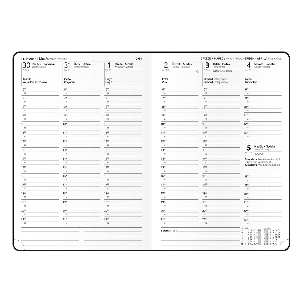 Wymiary: 143 x 205 mm Format: A5 Kalendarz: tygodniowy nominalny czeski i słowacki Mutacje językowe: CZ, SK, EN, DE Materiał okładki: materiał o drobnej strukturze Papier: biały w perforowanych rolkach Liczba stron: 144 Wiązanie: szyte wiązanie V8