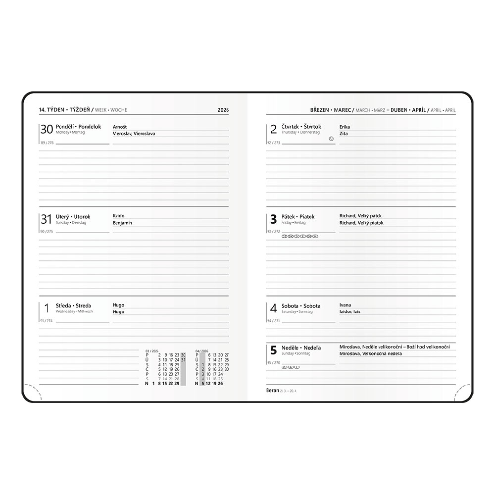 Wymiary: 120 x 165 mm Format: B6 Kalendarz: tygodniowy nominalny czeski i słowacki Mutacje językowe: CZ, SK, EN, DE Materiał okładki: pokryty matowym laminatem odpornym na zarysowania ze złotym tłocczeniem Papier: biały w perforowanych rolkach , gumka