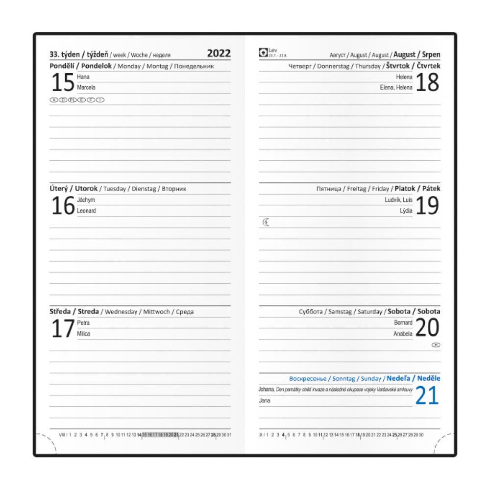 Rozmiar bloku: 75 x 150 mm Format: książkowy Kalendarium: tygodniowe czeskie i słowackie z imionami Mutacje językowe: CZ, SK, ANG, D, RU Materiał wierzchni: strukturalny o błyszczącej powierzchni Kolor bloku: biały, okrągłe odrywane rogi Ilość stron