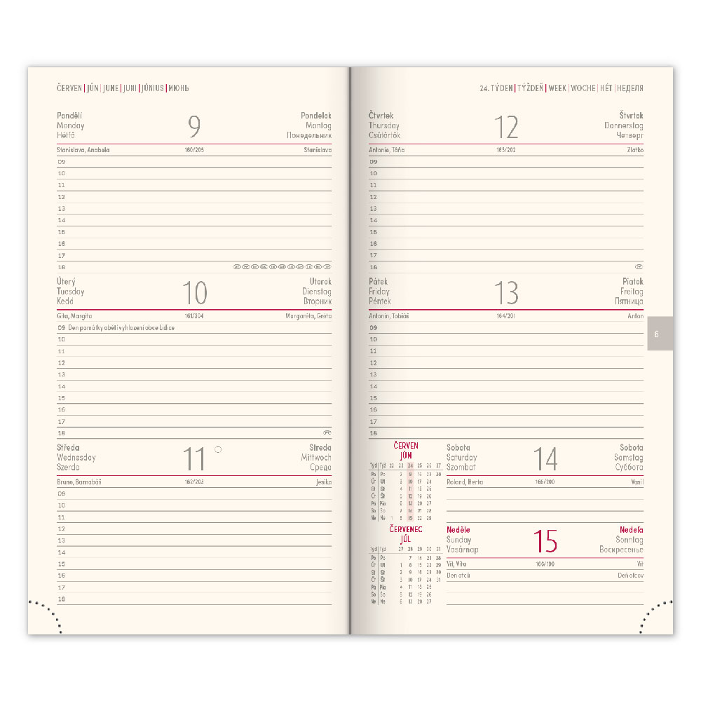 Wymiary: 9 x 15,5 cm Format: kieszeń Kalendarium: 6-języczne tygodniowe od grudnia 2024 (CZ, SK, GB, DE, HU, RU) Liczba stron: 128 stron Materiał okładki: gładka matowa skóra ekologiczna Oprawa: księga twarda Kolor bloku: biały Dziennik zawiera: miejsce