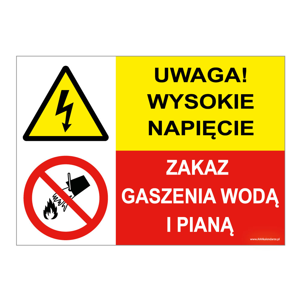 UWAGA! WYSOKIE NAPIĘCIE... - ZAKAZ GASZENIA WODĄ I PIANĄ, ZNAK ŁĄCZONY, płyta PVC 1 mm, 210x148 mm