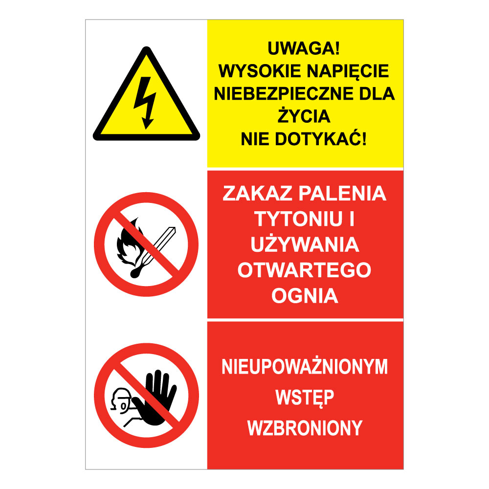 UWAGA! WYSOKIE NAPIĘCIE... - ZAKAZ PALENIA TYTONIU... - NIEUPOWAŻNIONYM..., płyta PVC 2 mm, 148x210 mm