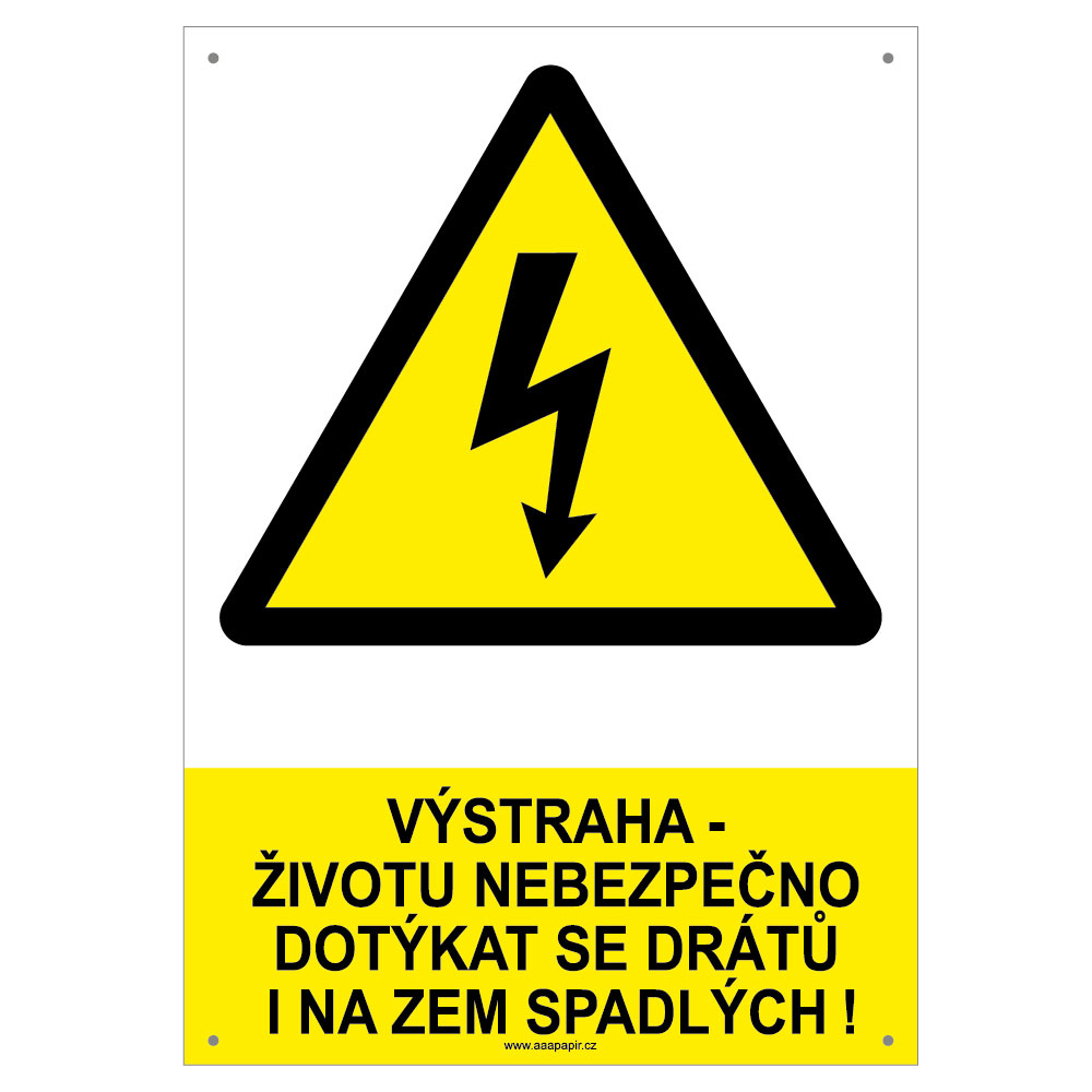 VÝSTRAHA - ŽIVOTU NEBEZPEČNO DOTÝKAT SE DRÁTŮ I NA ZEM SPADLÝCH - bezpečnostní tabulka s dírkami, plast A4, 2 mm