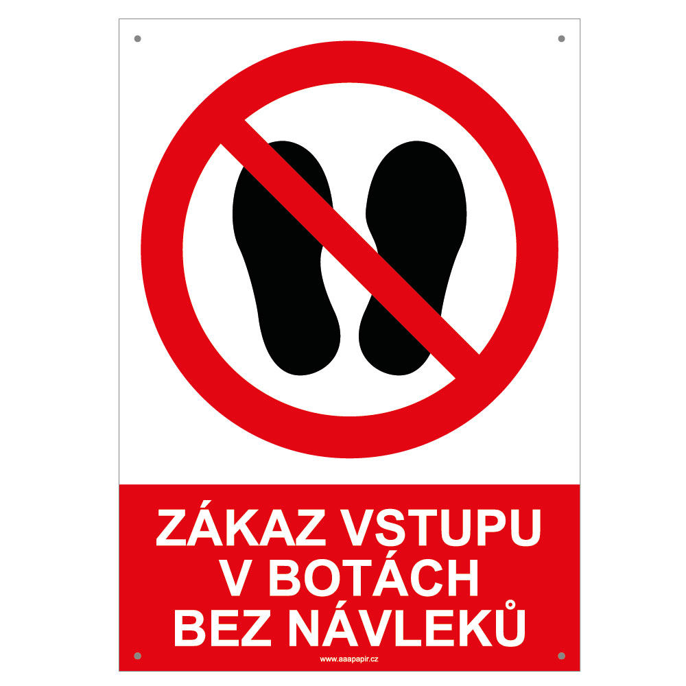 ZÁKAZ VSTUPU V BOTÁCH BEZ NÁVLEKU - bezpečnostní tabulka s dírkami, plast A5, 2 mm