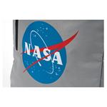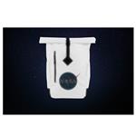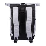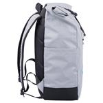 • Srebrny roll-top plecak uszyty z odblaskowego materiału.